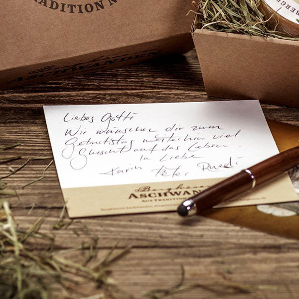 Je länger der Käse gelagert und gepflegt wird, desto würziger wird er. Deshalb reiben wir unsere Bergkäse regelmässig mit Schmierwasser ein, um sie vor dem Austrocknen zu schützen. Das Käsebrett aus Tannenholz, auf dem die Käse lagern, trägt dabei zur Regulierung des Klimas bei. Die schöne rötliche oder weisse Naturrinde entsteht während des Reifungsprozesses.